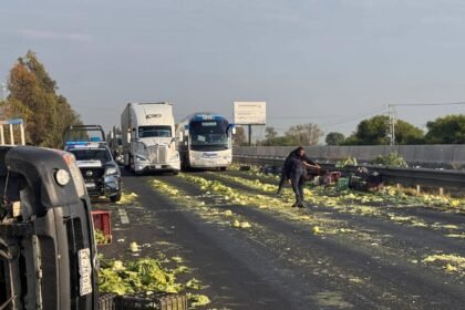 Volcadura de camioneta con carga de lechuga provoca tráfico en la 57, en Pedro Escobedo