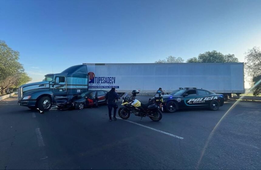 El Marqués, Qro.– Elementos de la Policía Municipal de El Marqués atendieron la mañana de este martes un accidente de tránsito sobre la carretera estatal 210, a la altura del fraccionamiento Sendas.