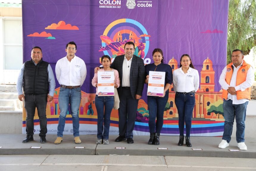 Colón, Qro.– En gira de trabajo, el presidente municipal de Colón, Gaspar Trueba Moncada, se reunió con habitantes de la comunidad de La Esperanza para presidir la entrega de adocreto en beneficio de las escuelas primarias “J. Guadalupe Velázquez”, turno matutino, y “Octavio Paz”, turno vespertino, con el objetivo de mejorar las condiciones de los planteles educativos.