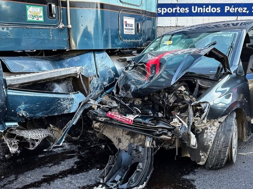 De acuerdo con los primeros reportes, el conductor del vehículo particular circulaba a exceso de velocidad y no logró detener su marcha al encontrarse con la pesada unidad, por lo que terminó impactándose de costado. A consecuencia del choque, el tractocamión quedó atravesado sobre la vialidad con la caja seca, lo que provocó el bloqueo parcial de la circulación.