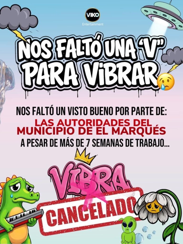 Querétaro, Qro.- El festival Vibra, que estaba previsto para realizarse este 21 de marzo en Querétaro, fue cancelado oficialmente, informaron los organizadores a través de redes sociales, luego de que el evento no obtuviera la autorización correspondiente por parte de la Secretaría de Gobierno del municipio de El Marqués.