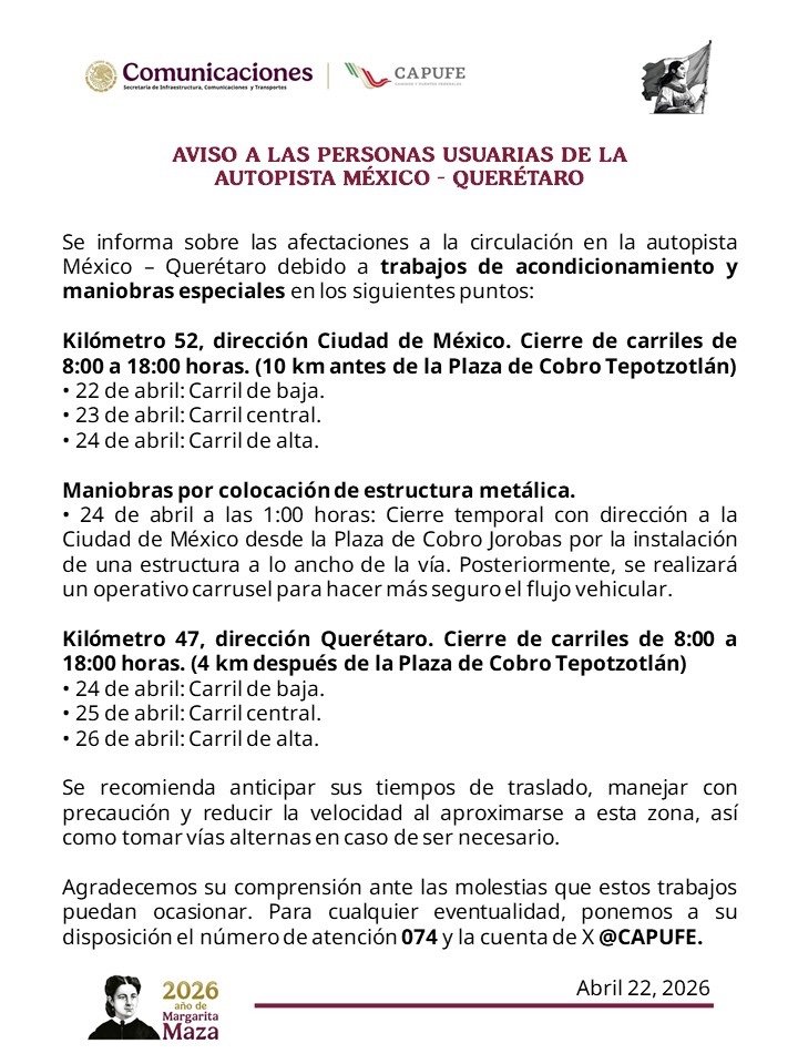 Querétaro, Qro.- Caminos y Puentes Federales emitió un aviso dirigido a usuarios de la autopista México–Querétaro, en el que advierte sobre afectaciones a la circulación debido a trabajos de acondicionamiento y maniobras especiales en distintos tramos.