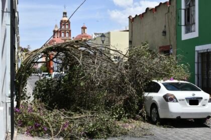 Ráfagas de viento provocan caída de árbol en Rancho San Pedro; daña vehículo