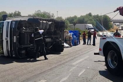 Camión cargado con abarrotes vuelca en el Libramiento Norponiente