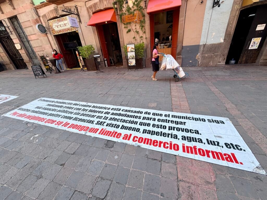 “El comercio establecido del Centro Histórico está cansado de que el municipio siga realizando tratos con líderes de ambulantes para entregar más espacios públicos sin pensar en la afectación que esto provoca”, expresaron en las lonas colocadas en la zona.