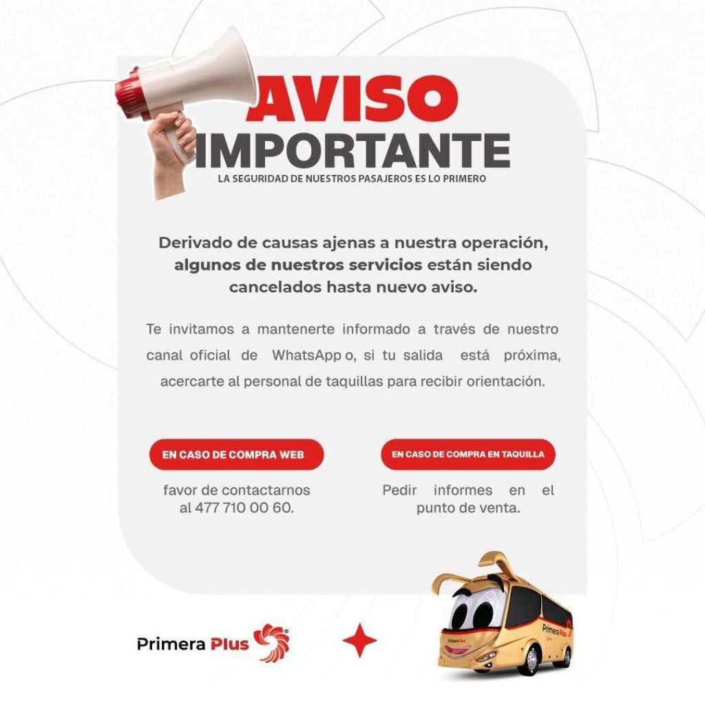 La compañía exhortó a los usuarios a mantenerse atentos a sus canales oficiales y acercarse al personal de taquillas para recibir orientación cuando la salida esté próxima. Los cambios de boletos adquiridos vía web deben gestionarse al número 477 710 0060, mientras que las compras en taquilla deben tramitarse en el mismo punto de venta.