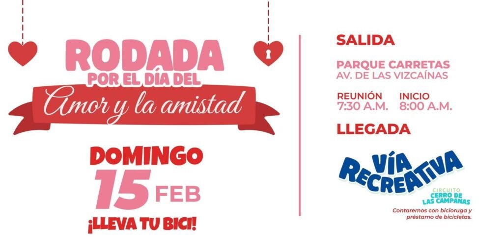 Querétaro, Qro.- Con motivo del Día del Amor y la Amistad, el próximo domingo 15 de febrero se llevará a cabo la Rodada por el Día del Amor y la Amistad, una actividad recreativa abierta a la ciudadanía, con salida desde el Parque Carretas, ubicado sobre la avenida de Las Vizcaínas.