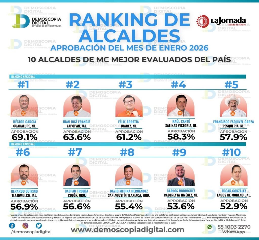 El ranking, que responde a la pregunta sobre cómo se ubican los gobiernos municipales de Movimiento Ciudadano frente a la aprobación ciudadana a nivel nacional, es encabezado por Héctor García, alcalde de Guadalupe, Nuevo León, con una aprobación del 69.1 por ciento. Le siguen Juan José Frangie, presidente municipal de Zapopan, Jalisco, y Félix Arratia, alcalde de Juárez, Nuevo León.