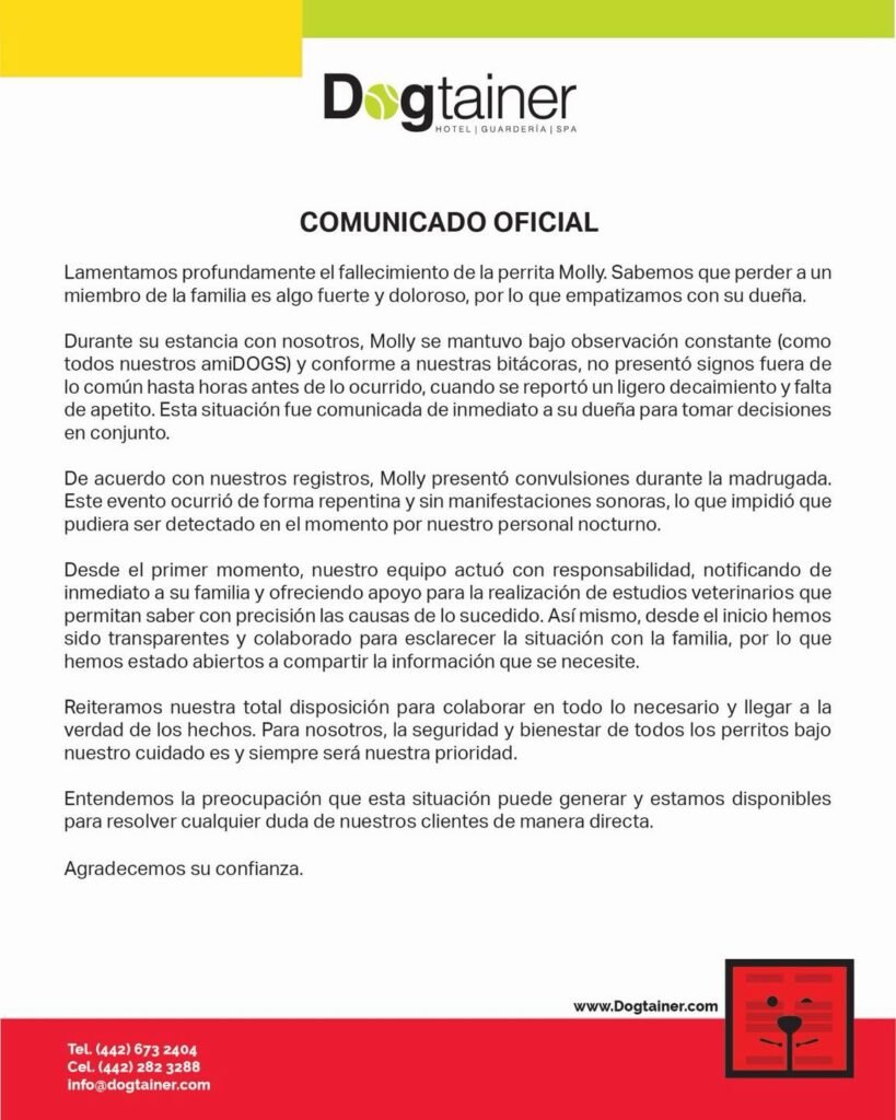 Querétaro, Qro.- El hotel canino Dogtainer emitió un posicionamiento oficial tras la muerte de Mollie, una perrita cuyo fallecimiento ha generado indignación y exigencias de justicia por parte de la ciudadanía. El establecimiento se ubica en la zona de Juriquilla.
