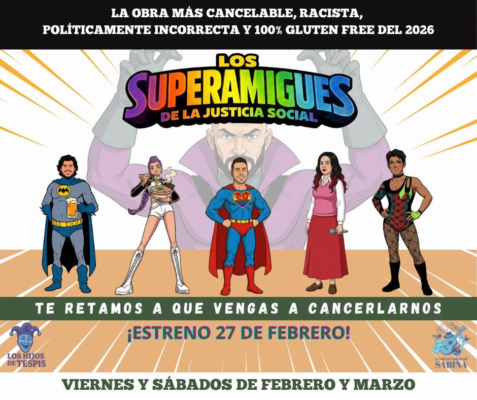 La cartelera cerrará el 27 de febrero con el estreno de Los Superamigues de la Justicia Social, una producción original del foro que apuesta por la sátira para abordar uno de los debates más vigentes: el lenguaje inclusivo. A través de personajes que se asumen como vigilantes del discurso, la obra expone contradicciones, egos y tensiones que surgen cuando las buenas intenciones se enfrentan a la necesidad de tener la razón.