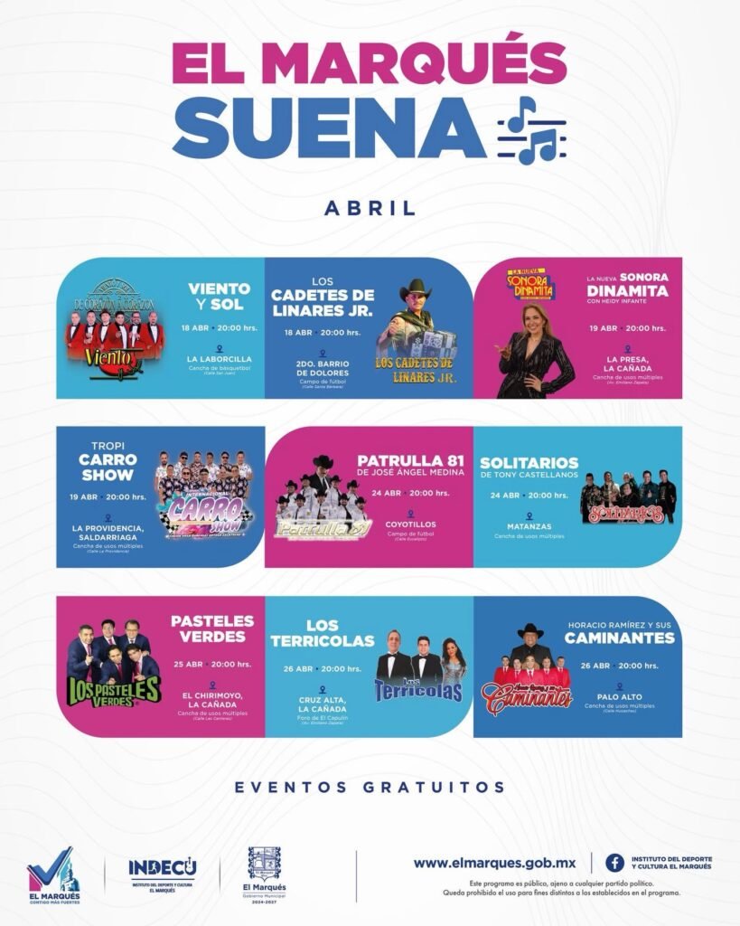 El Marqués, Qro.— El Instituto del Deporte y Cultura de El Marqués (INDECU) anunció una nueva edición del festival musical “¡El Marqués Suena!”, una iniciativa que durante abril llevará espectáculos gratuitos a distintas localidades del municipio para promover la convivencia social y el acceso a la cultura.