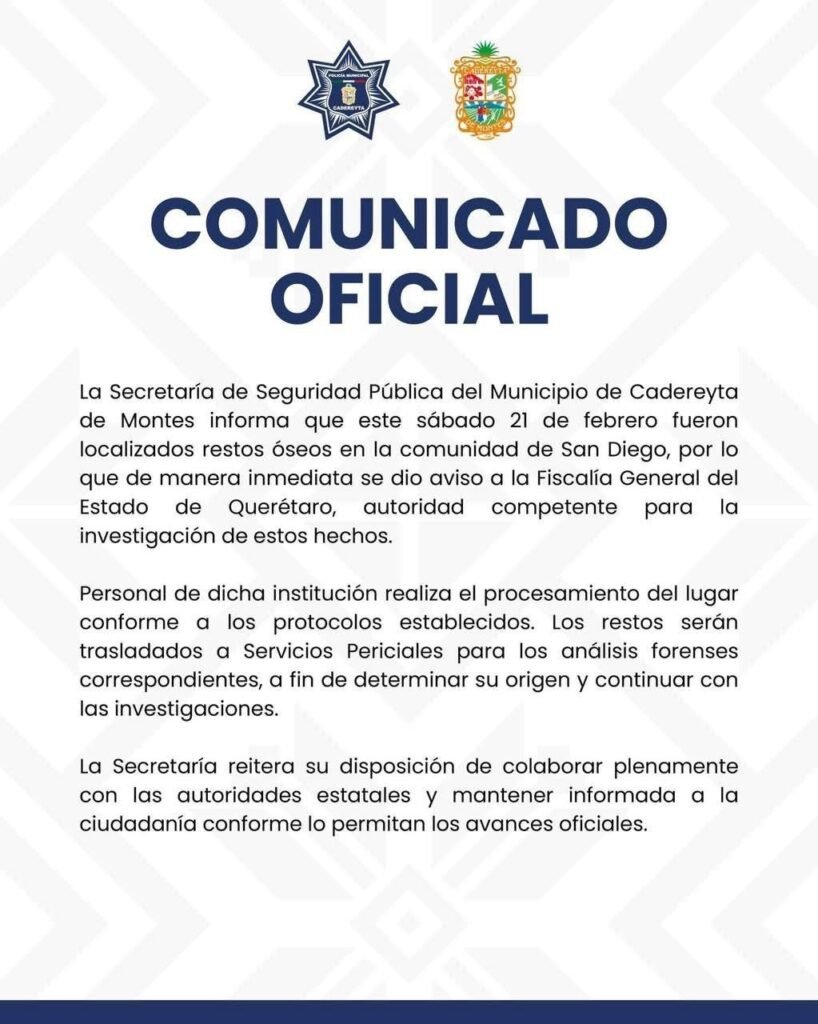 Cadereyta de Montes, Qro.– La Secretaría de Seguridad Pública Municipal de Cadereyta de Montes informó que este sábado 21 de febrero fueron localizados restos óseos en la comunidad de San Diego.