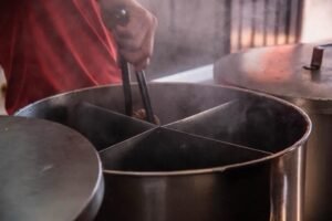 En el patio central de una antigua casona, una gran mesa rectangular sostenía al menos seis ollas vaporeras. Cada vez que los vendedores levantaban las tapas y retiraban las bolsas térmicas, el vapor liberaba el característico olor de la masa cocida, atrayendo a comensales de todas las edades.