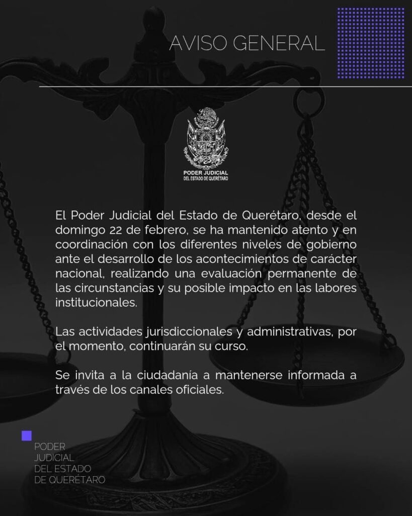 En el mismo contexto, se dio a conocer que el Poder Judicial del Estado de Querétaro se mantiene atento y en coordinación con los distintos niveles de gobierno desde el domingo 22 de febrero, ante el desarrollo de los acontecimientos de carácter nacional, realizando una evaluación permanente sobre su posible impacto en las labores institucionales.