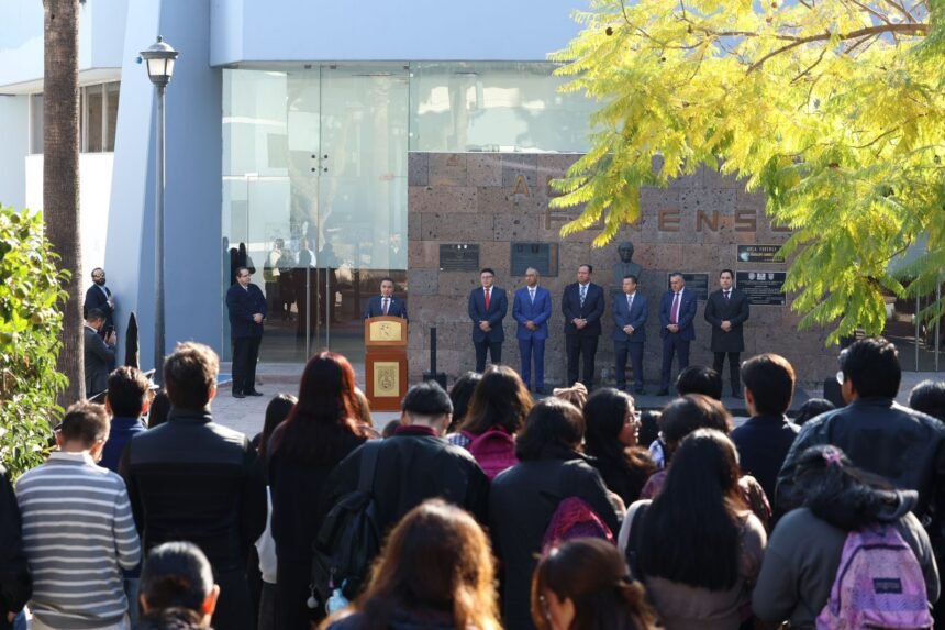 Previamente, en la ceremonia de honores a la bandera en la explanada del Aula Forense, el secretario de Gobierno convivió con estudiantes de la Facultad de Derecho y resaltó que este aniversario es una oportunidad para explorar nuevas perspectivas del conocimiento y fomentar el espíritu genuino de la Carta Magna.