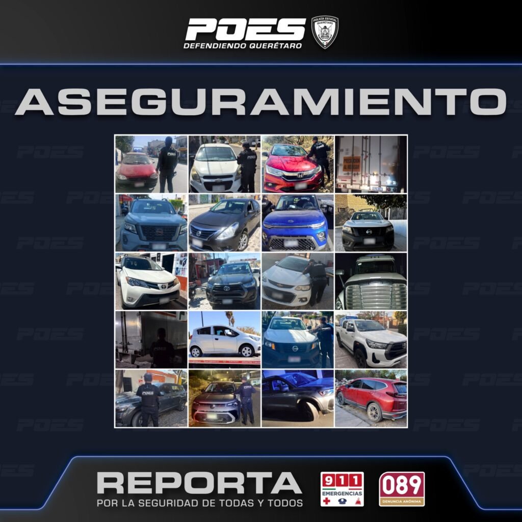 Querétaro, Qro.- Como parte de las acciones operativas desplegadas en distintos puntos de la entidad, la Policía Estatal de Querétaro aseguró 20 unidades vehiculares que contaban con reporte de robo vigente.