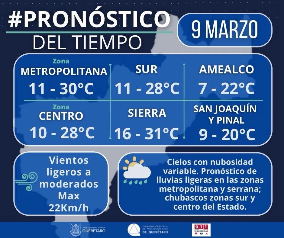 Querétaro, Qro.- Para este 9 de marzo, en el estado de Querétaro se prevé un ambiente fresco durante la mañana y cálido por la tarde, con temperaturas máximas que podrían alcanzar hasta los 30 grados centígrados, de acuerdo con el pronóstico emitido por autoridades de protección civil.