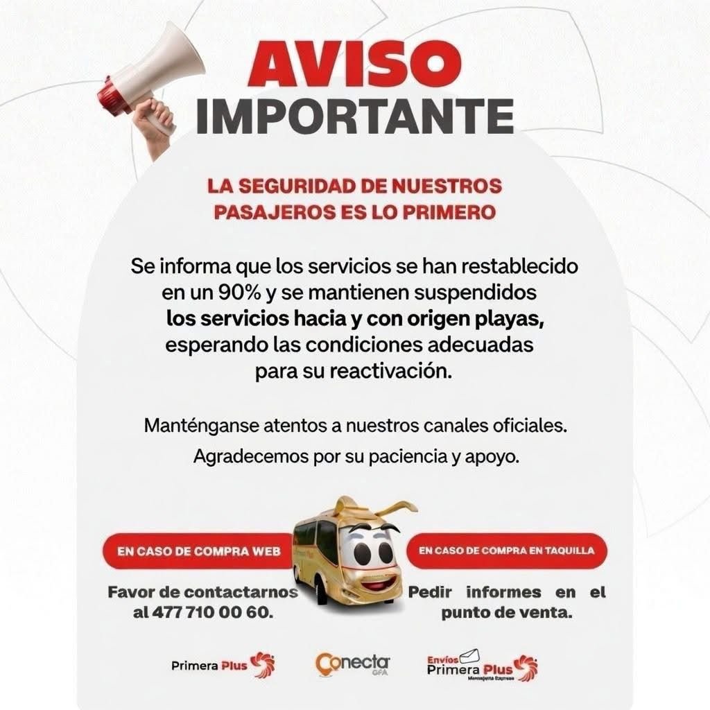 Finalmente, Primera Plus exhortó a los pasajeros a mantenerse atentos a sus canales oficiales para conocer actualizaciones sobre el restablecimiento total de las rutas y agradeció la paciencia y el apoyo de sus usuarios.
