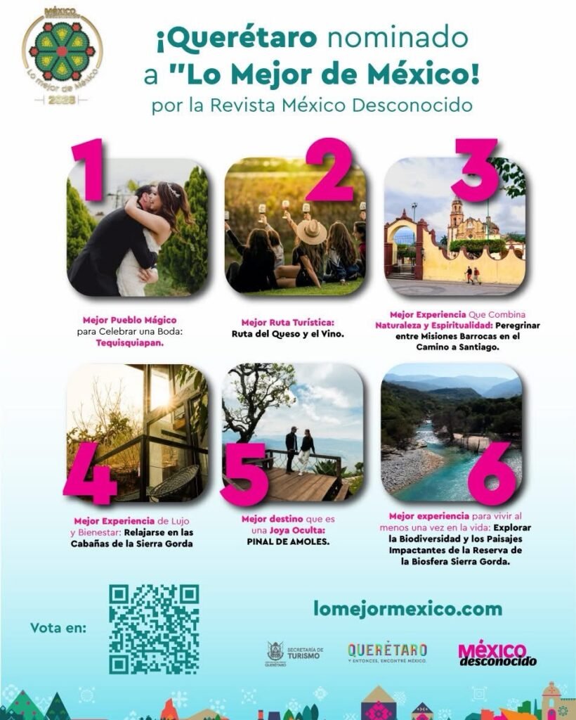 La Secretaría de Turismo del Estado de Querétaro invitó a la ciudadanía a participar en la votación a través del sitio oficial lomejormexico.com, con el objetivo de posicionar a la entidad como un referente turístico a nivel nacional e internacional.