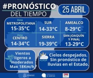 Querétaro, Qro.— Este sábado 25 de abril, la zona metropolitana de Querétaro registrará un incremento en las temperaturas, con una máxima de hasta 35 grados Celsius y una mínima de 15 grados, de acuerdo con el pronóstico meteorológico.