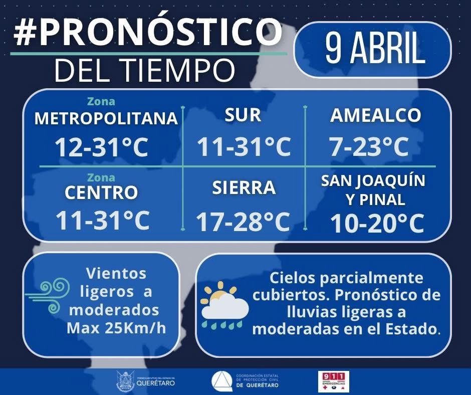 Querétaro, Qro.- La zona metropolitana de Querétaro registrará un ambiente caluroso este miércoles 9 de abril, con temperaturas que oscilarán entre los 12 y los 31 grados Celsius, de acuerdo con el pronóstico emitido por autoridades de Protección Civil.