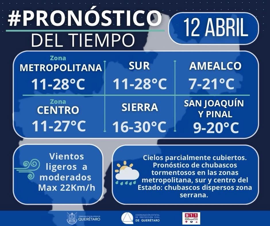 Querétaro, Qro.- La zona metropolitana de Querétaro registrará un ambiente cálido este sábado 12 de abril, con temperaturas que oscilarán entre los 11 y los 28 grados Celsius, de acuerdo con el reporte emitido por la Coordinación Estatal de Protección Civil de Querétaro.