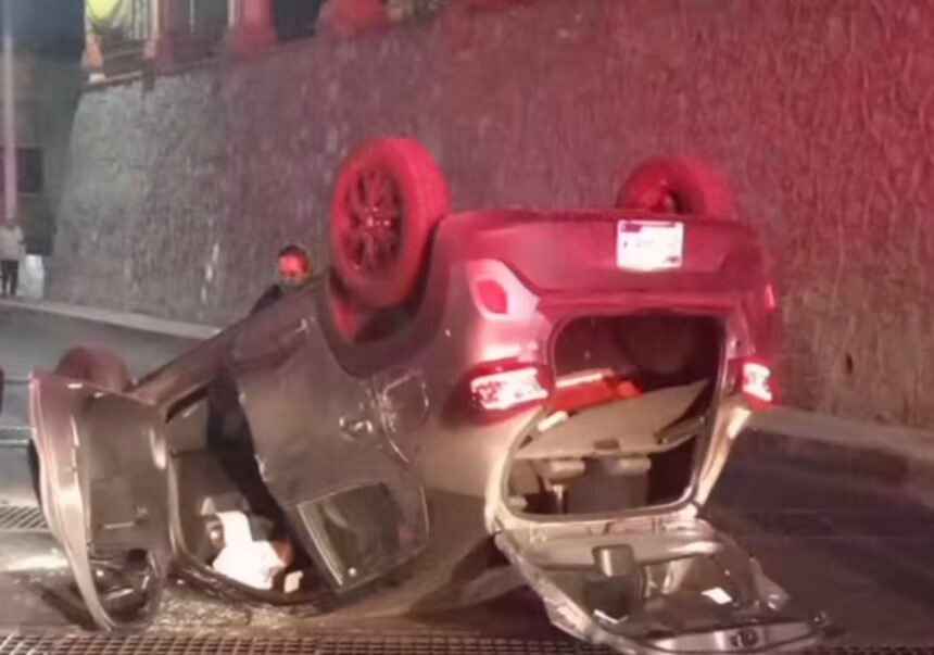 Querétaro, Qro.- La noche de este martes se registró la volcadura de un vehículo en los carriles laterales de la Carretera Federal 57, a la altura del cruce con la Avenida Cimatario.