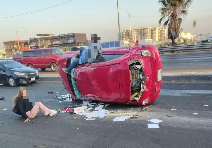 Querétaro, Qro.- Esta mañana se registró la volcadura de un vehículo sobre los carriles laterales de la carretera México–Querétaro, antes de llegar a La Comer Estadio, en el municipio de Querétaro.